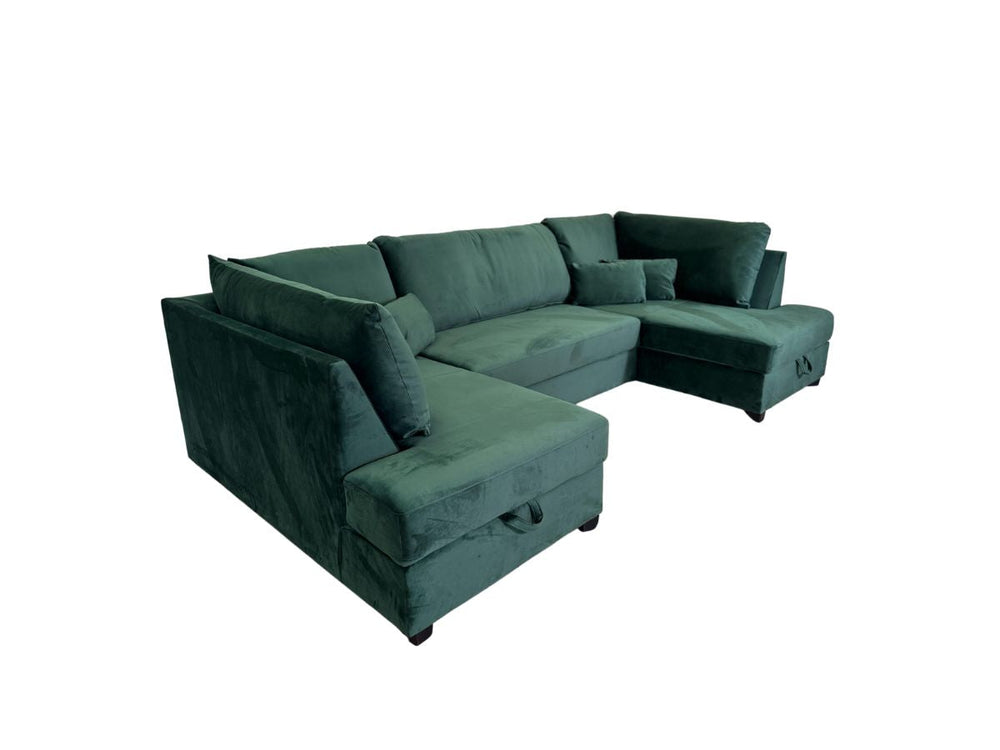Whether you live in a small apartment or a spacious home, the U shaped Meri Emerald Green sofa bed with storage is the perfect addition to any living space. But what sets this sofa apart from the rest is its hidden storage compartments and pull-out bed. The spacious storage compartments offer ample space to store blankets, pillows, and other essentials, keeping your living space clutter-free. And when it's time to turn in for the night, simply pull out the bed and enjoy a restful night's sleep. Order your Meri Emerald Green sofa bed with storage today and experience the ultimate in comfort, U-shaped style, and functionality.